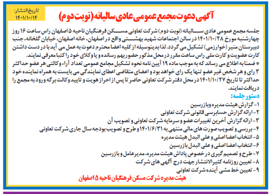 جلسه مجمع عمومي عادي ساليانه ( نوبت دوم ) شركت تعاوني مسكن فرهنگيان ناحيه 5 اصفهان راس