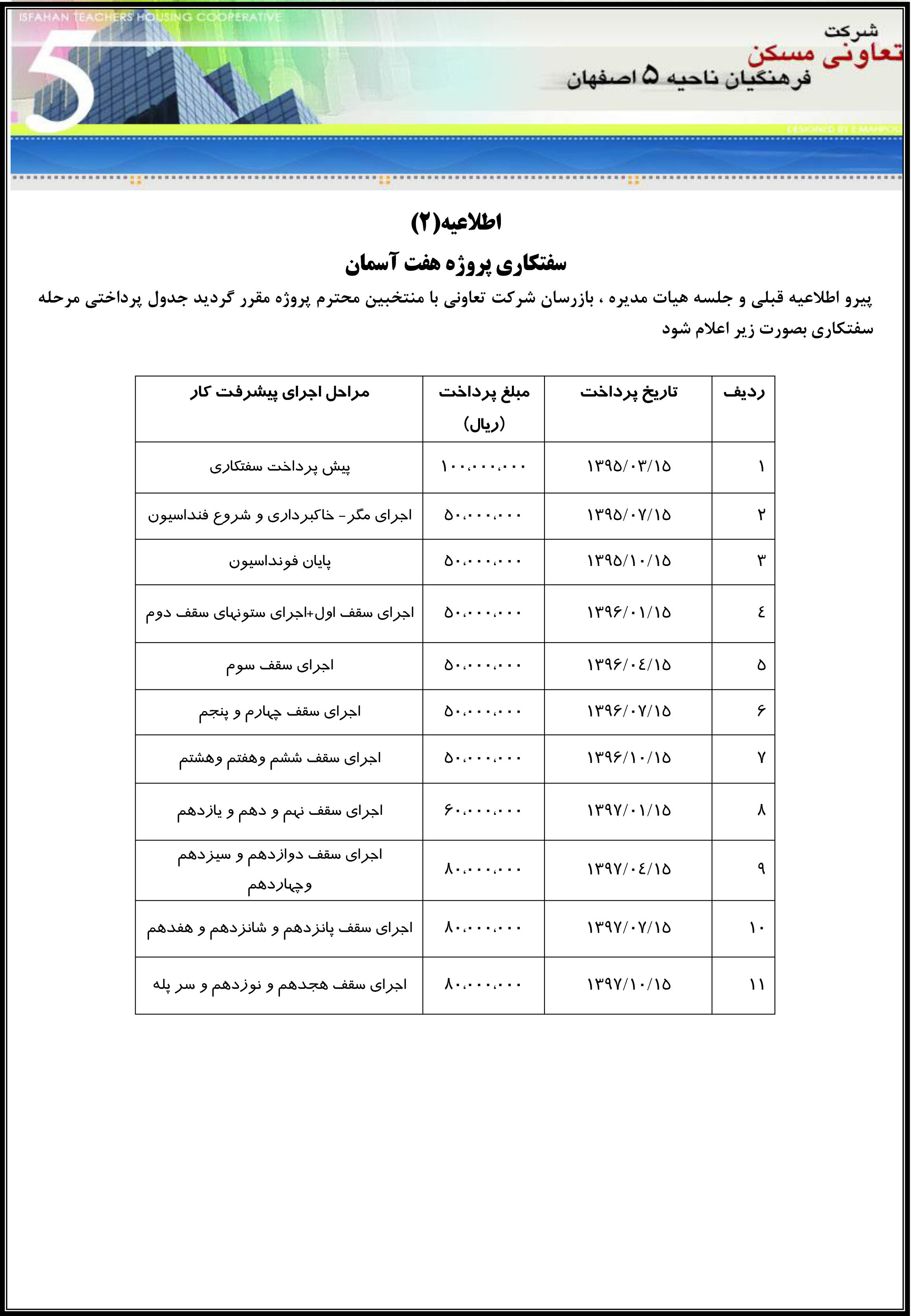 اطلاعیه جدول سفتکاری پروژه هفت آسمان